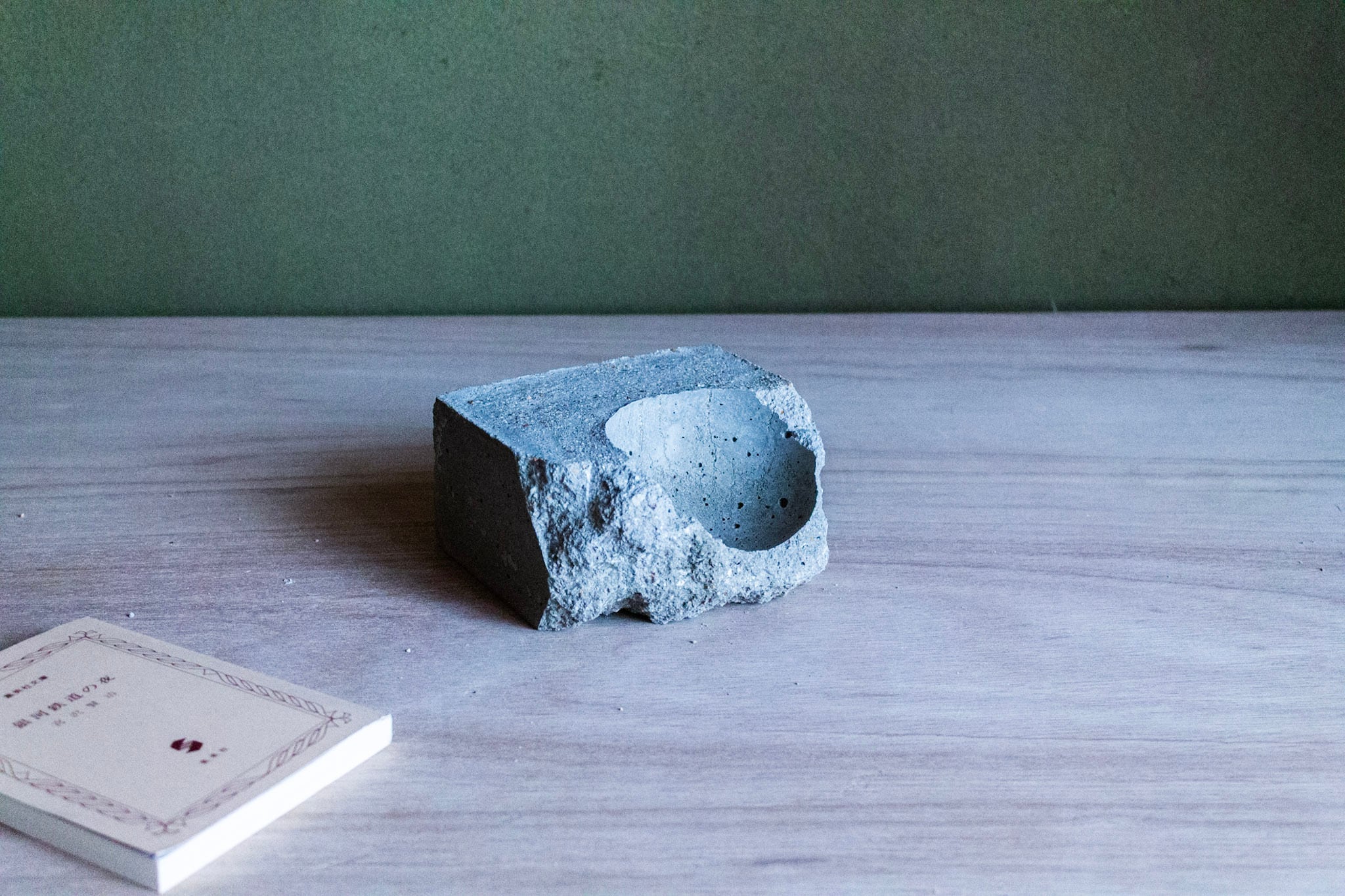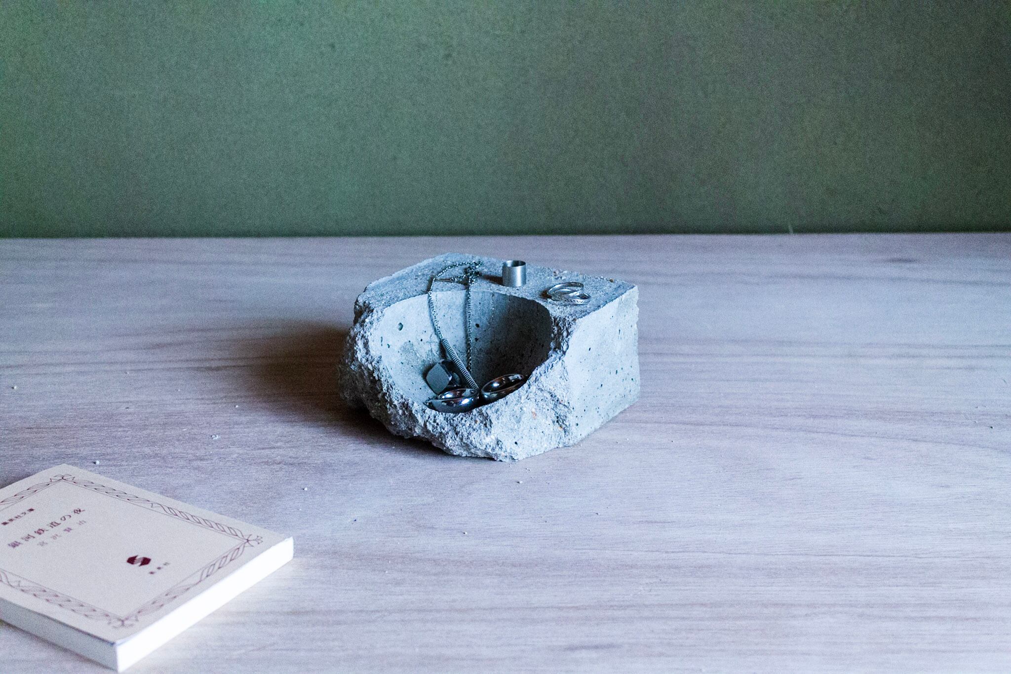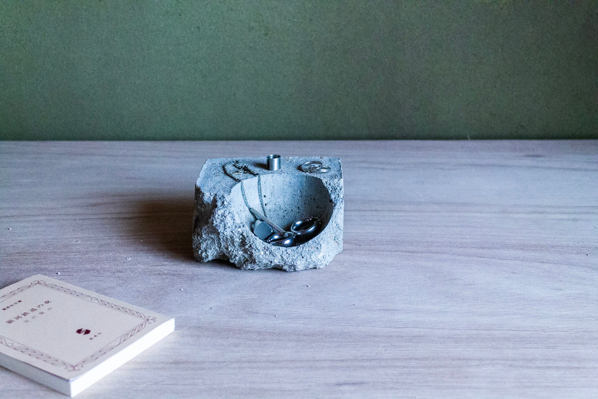 コンクリートブロックを丸くくり抜いたアクセサリートレイ。