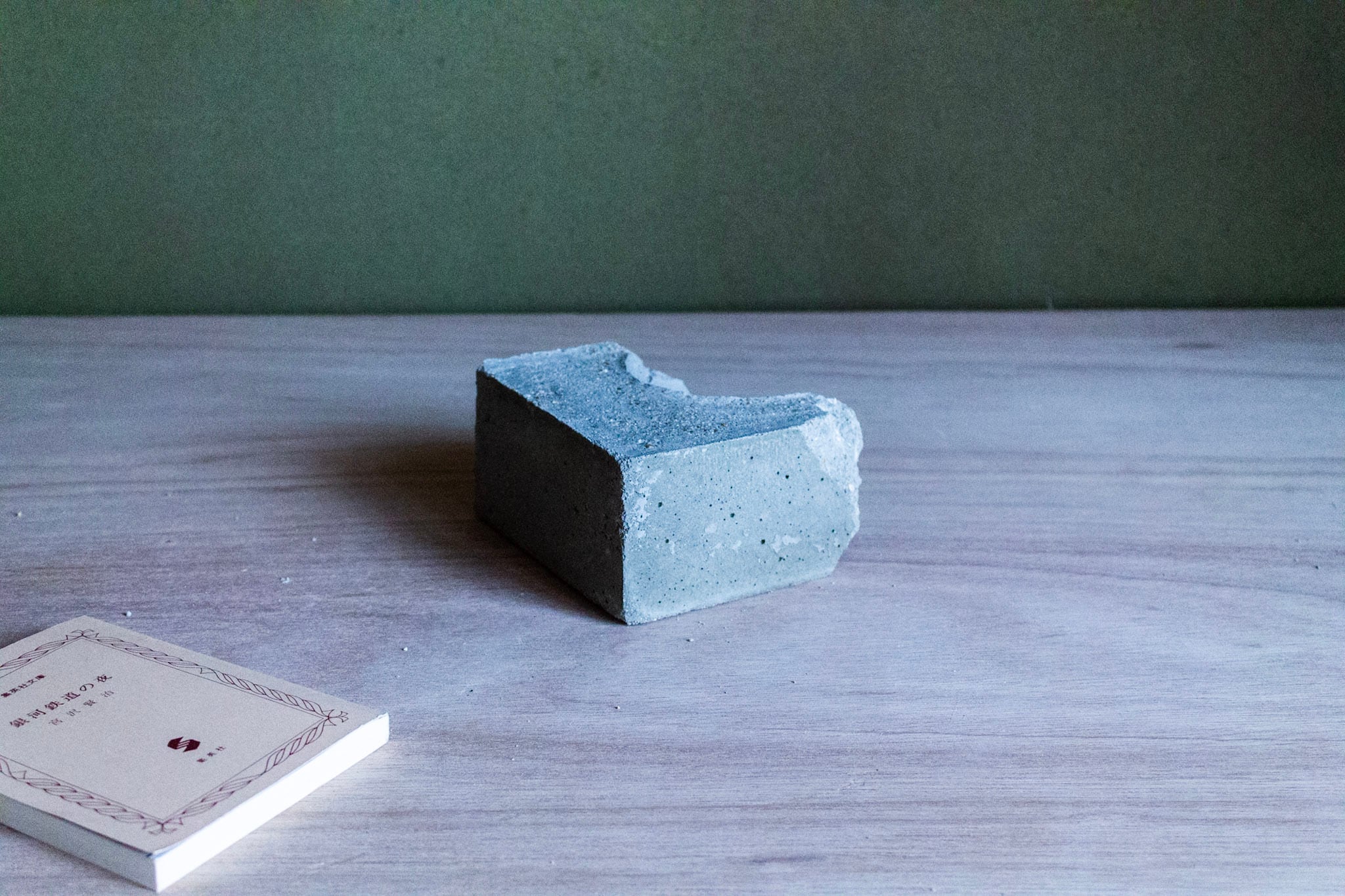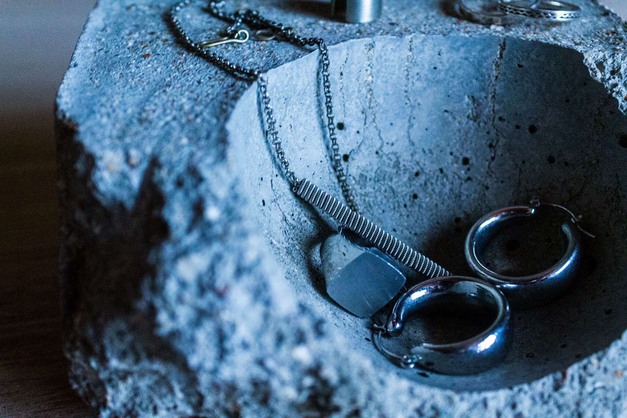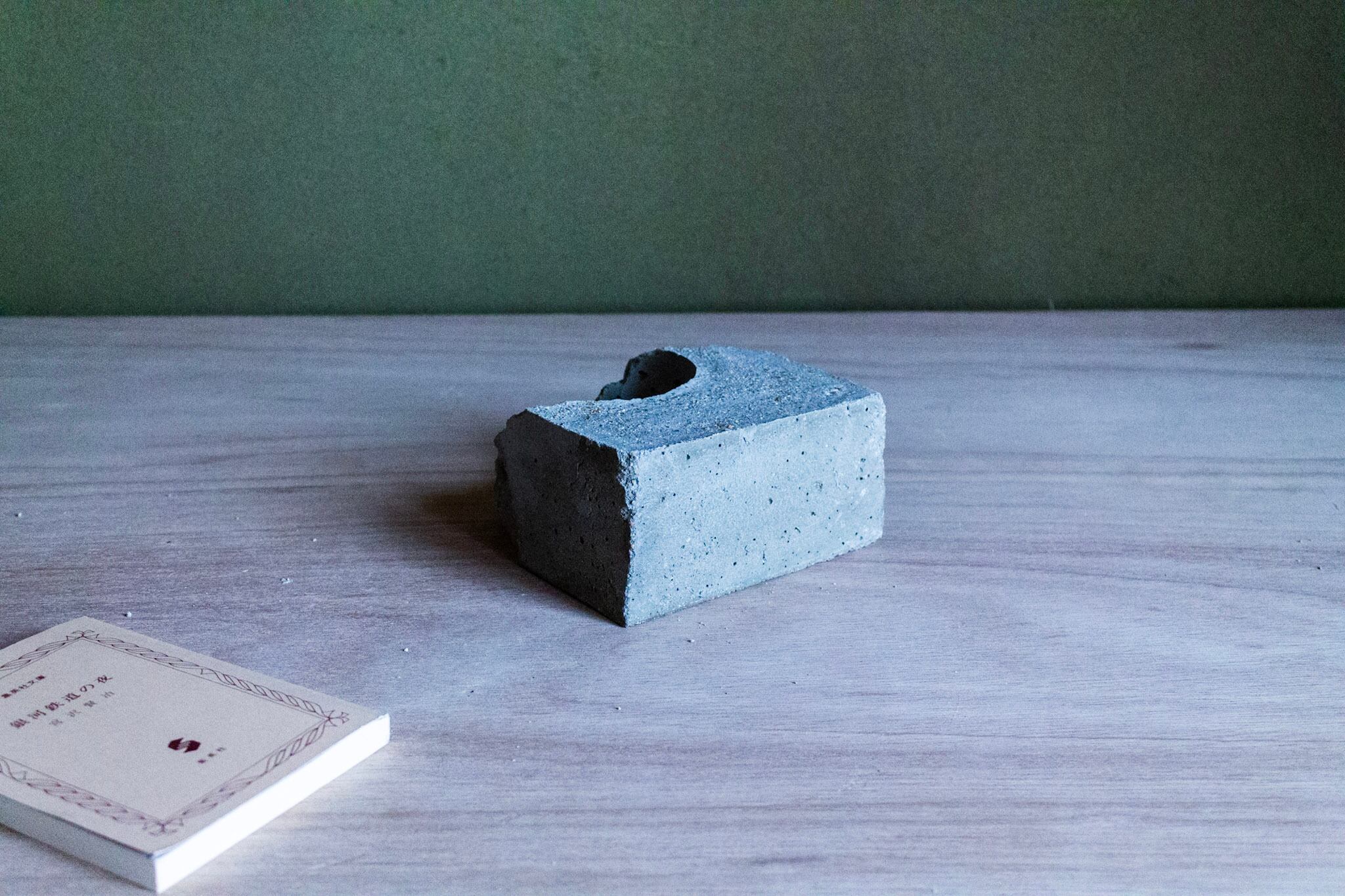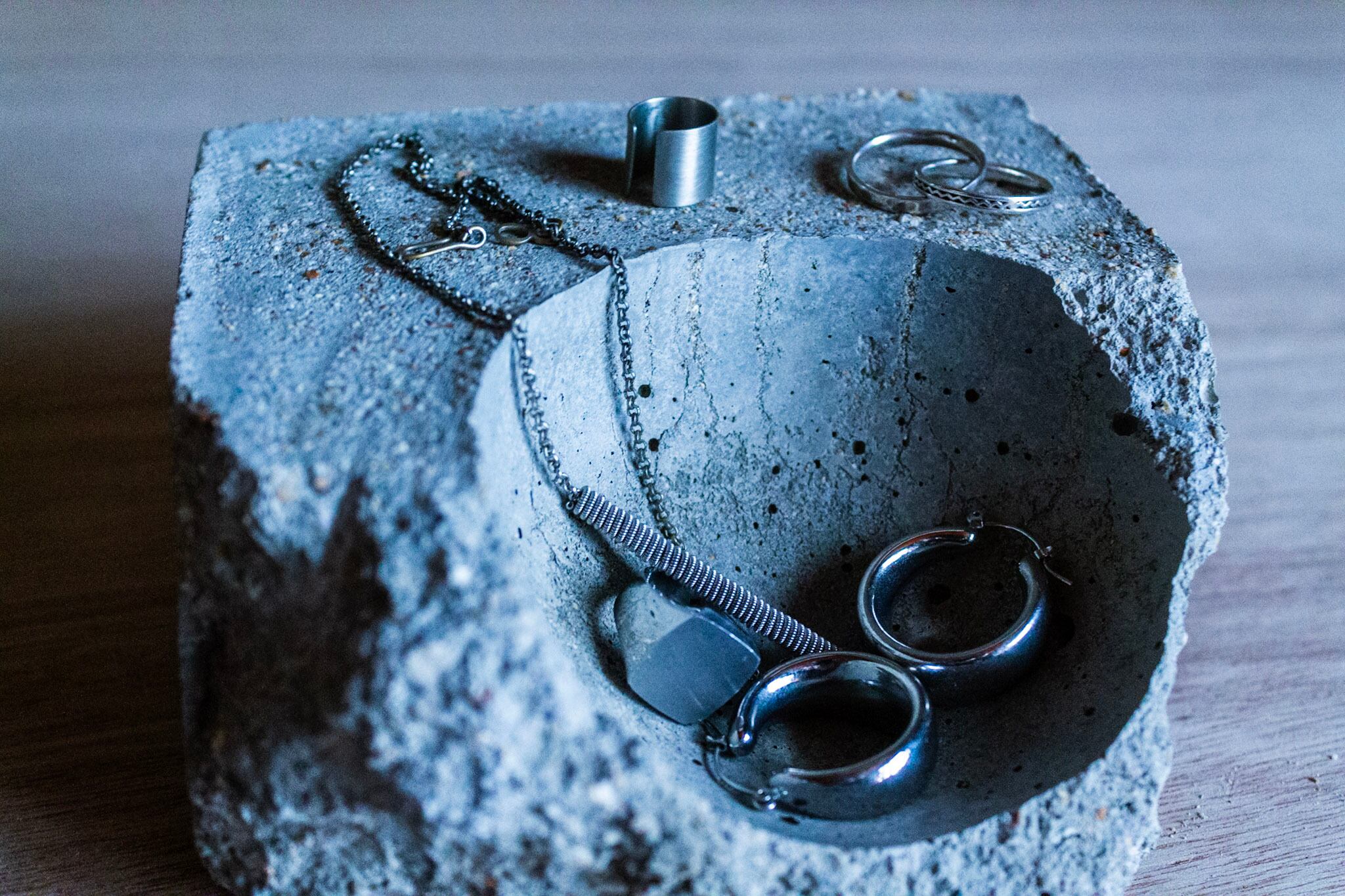コンクリートブロックを丸くくり抜いたアクセサリートレイ。